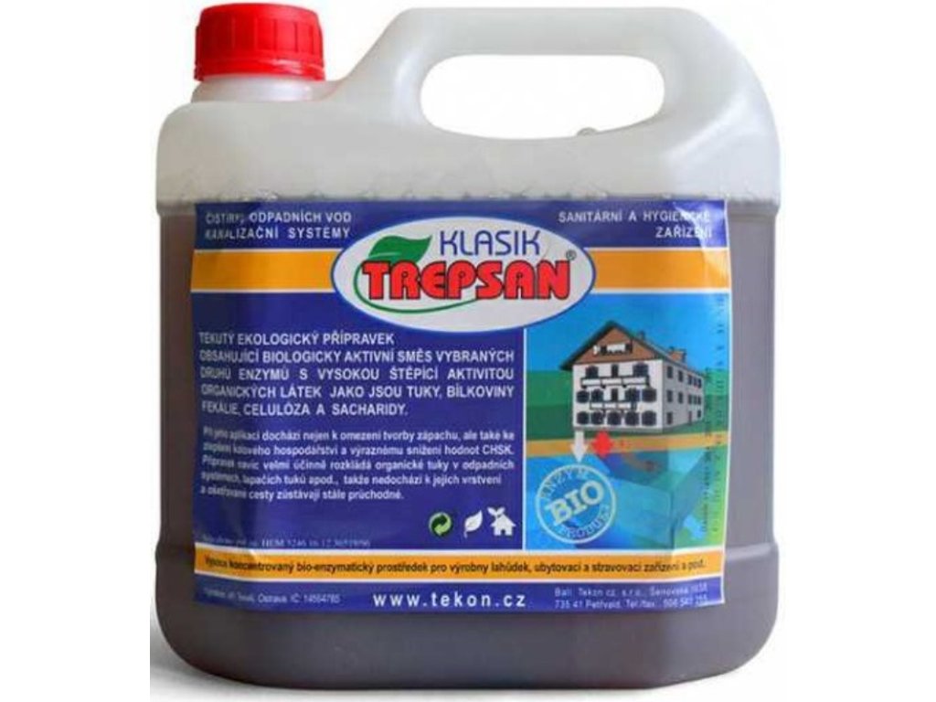 Trepsan Klasik je ideální nalít do kuchyňského nebo koupelnového odpadu, kde už v začátku rozkládá tuky a tím předchází ucpávání potrubí. Je také možné ho aplikovat přímo do vstupní části čistírny. Výrobku nevadí ani protékající voda, protože se okamžitě naváže na nečistoty i staršího data.